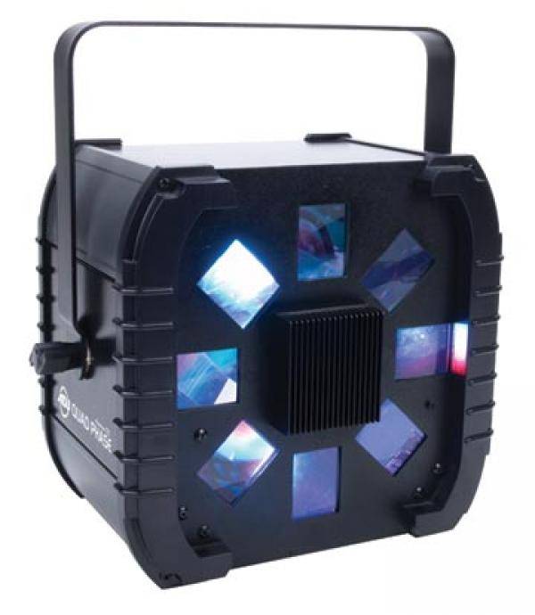 The Quad Phase also offers all the latest features sought after in special effects lights such as: DMX-512 for programming or linking capabilities, exciting built-in sound active programs, no duty cycle (run all night), a long life LED source (30,000 hours), 4-button DMX display on rear (for easier programmability), IEC power daisy-chaining, a 1.8 steeper motor for smooth movement and is compatible with ADJ's UC3 easy-to-use mini controller.