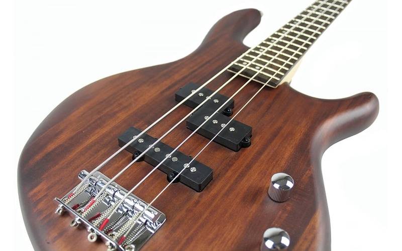 Basso a 4 corde, design moderno con doppio cutaway. Corpo in pioppo. Manico bolton in acero canadese. Tastiera in palissandro. 24 tasti. Scala 34. Meccaniche Diecasting. Pickup PSEB44/F &, PSEB14/R. Ponte EB6. Accessori cromati. Colore Open pore walnut
