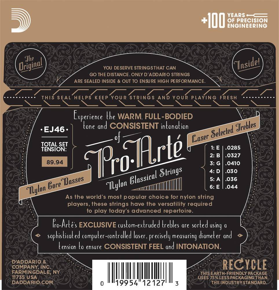 Pro-Arte, the world's most popular classical strings are D'Addario's premium classical guitar string sets. All Pro-Arte treble strings are sorted by a sophisticated computer-controlled laser machine which performs diameter and tension measurements, ensuring true-sounding, precise trebles in every set. Pro-Arte basses are wound using silver-plated copper on a multi-filament nylon core for consistent and warm, yet projecting tone.