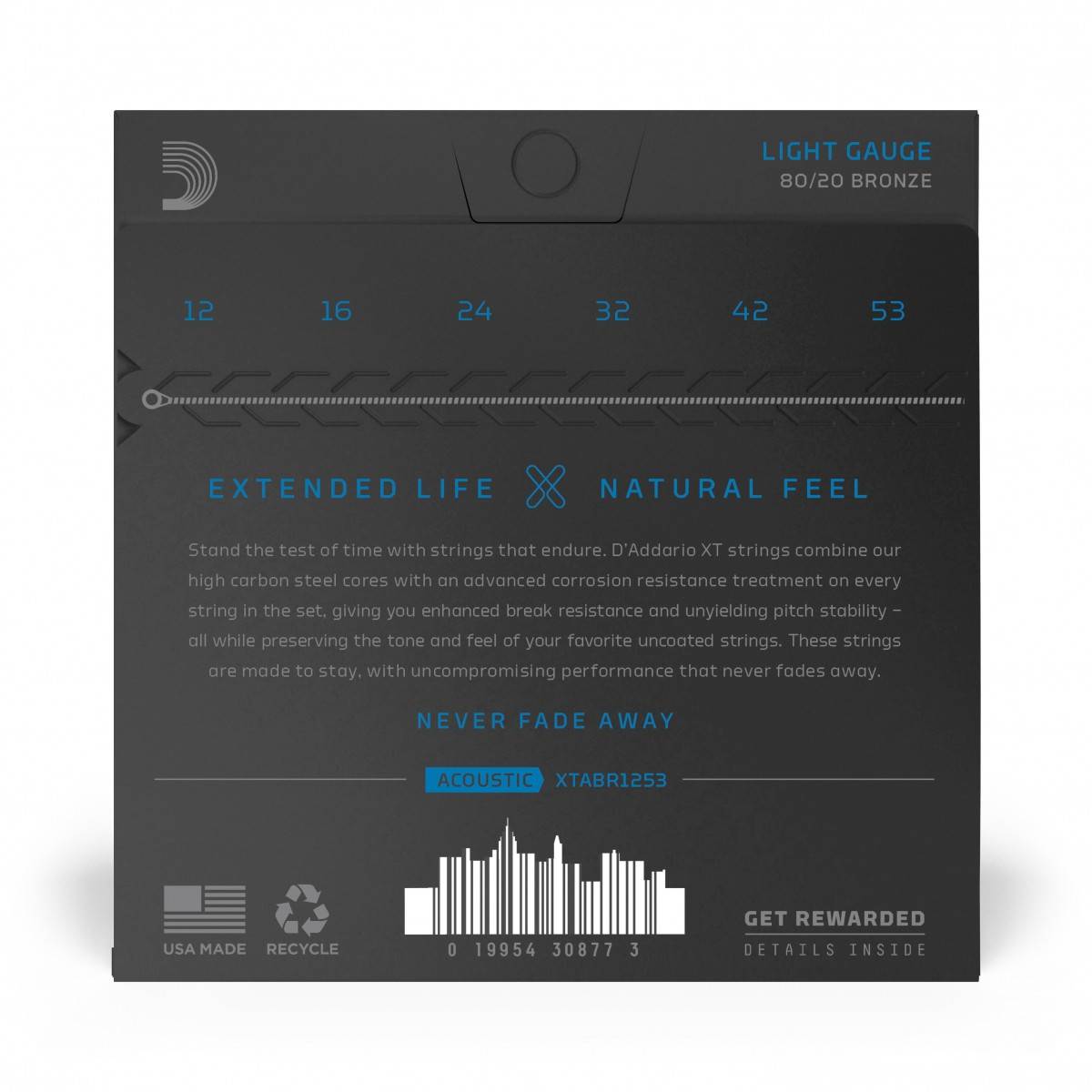 D'Addario XTABR1253, XT - Corde in bronzo 80/20 per chitarra acustica, scalatura leggera, 12-53