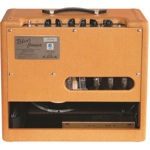 The Blues Jr. Lacquered Tweed takes Fender's 15W gem and gives it the true vintage treatment with a lacquered tweed covering and a vintage-voiced 12" Jensen speaker. Its golden tones are generated by an all-tube signal path using a pair of EL84 output tubes and 3 - 12AX7 preamp tubes. Add renowned Fender reverb, flexible controls, FAT switch for mid boost, and you're in business. And just look at that chrome panel, that tweed finish with vintage-style brown and gold grille cloth, and those vintage pointer knobs!