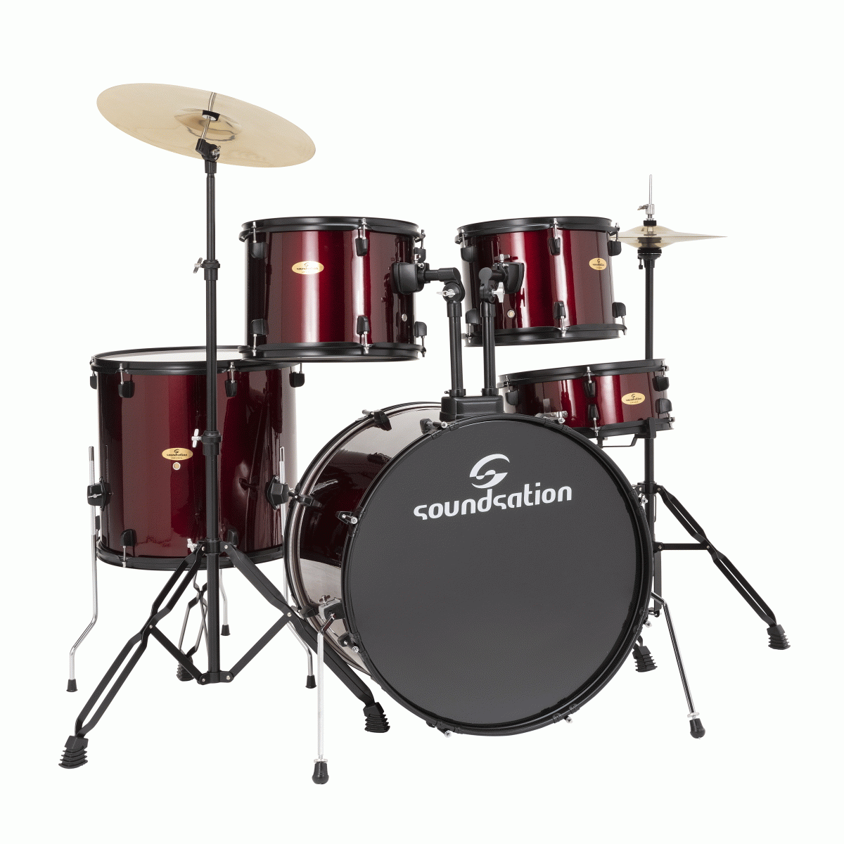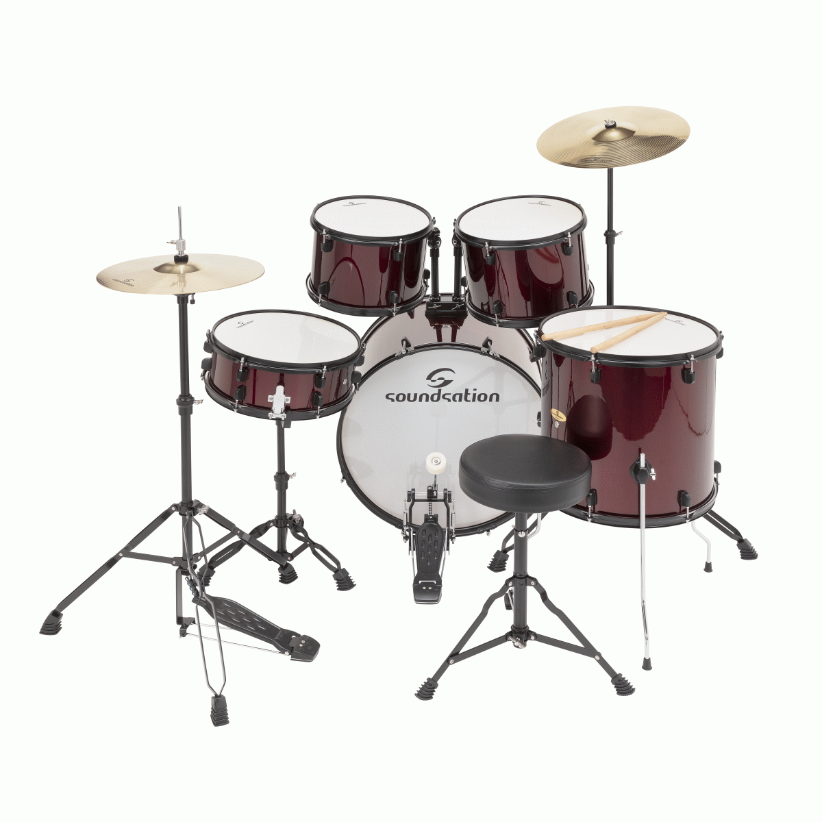 Fusti in Pioppo con risposta lineare Finiture rivestite Sistema di fissaggio Toms con braccetto 7/8" Hardware Serie SK 100 Blocchetti low-mass low-profile per una migliore risonanza Piedini grancassa angolati Pelli Soundsation® Hardware Black Piatto Hi-Hat da 14" e crash da 16" incluso Sgabello e bacchette inclusi Finitura: Wine Red