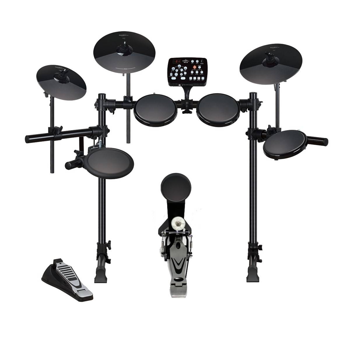 Drumkit elettonico completo da 5 pad e 3 piatti, pedale ottico Hi-Hat e pedale cassa Pad rullante con pelle natural feel e 2 zone di risposta Piatto crash da 12" con funzione choke, Ride da 12" e Hi-Hat da 8" Centralina compatta con connettore unico per un setup comodo e veloce 20 suoni Drumkit preimpostati con possibilità di editing fino a 184 suoni per componente 50 Demo song con fuzioni drum only e mute Rack pre-assemblato per una rapida installazione Pedale cassa incluso nella confezione