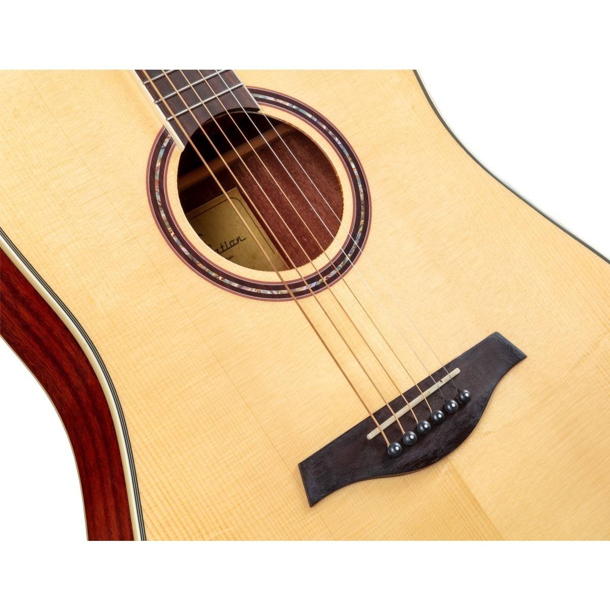 Dreadnought cutaway 4/4 Scala: 648 mm Top: abete massello Fondo e fasce: mogano Tastiera: palissandro Manico: okoume Radius: 16" Profilo manico: C Ampiezza nut: 43 mm Materiale nut: osso Ponte: palissandro Spessore cassa: 100-120 mm Binding: ivory ABS Meccaniche: Grover Preamp: Fishman GT-1 Finitura: glossy Natural Equipaggiata con D'Addario EXP16 strings