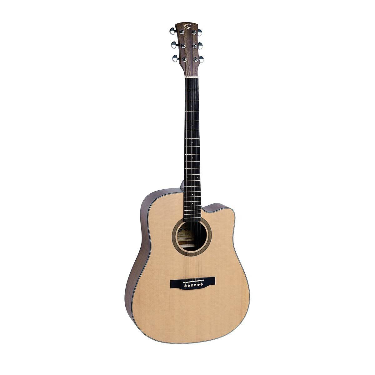 Top: Abete Sitka massello Fondo e fasce: mogano Manico: mogano satinato Tastiera: blackwood con tasti in madreperla Capotasto e sellette: osso Paletta: mogano con intarsio in legno Binding in celluloide nera sul corpo Ponte in blackwood Mascherina tartarugata Meccaniche originali GROVER Forma: dreadnougth cutaway Preamp: Fishman SON-GT4 Finitura: open pore satin Equipaggiata con corde d'Addario XP