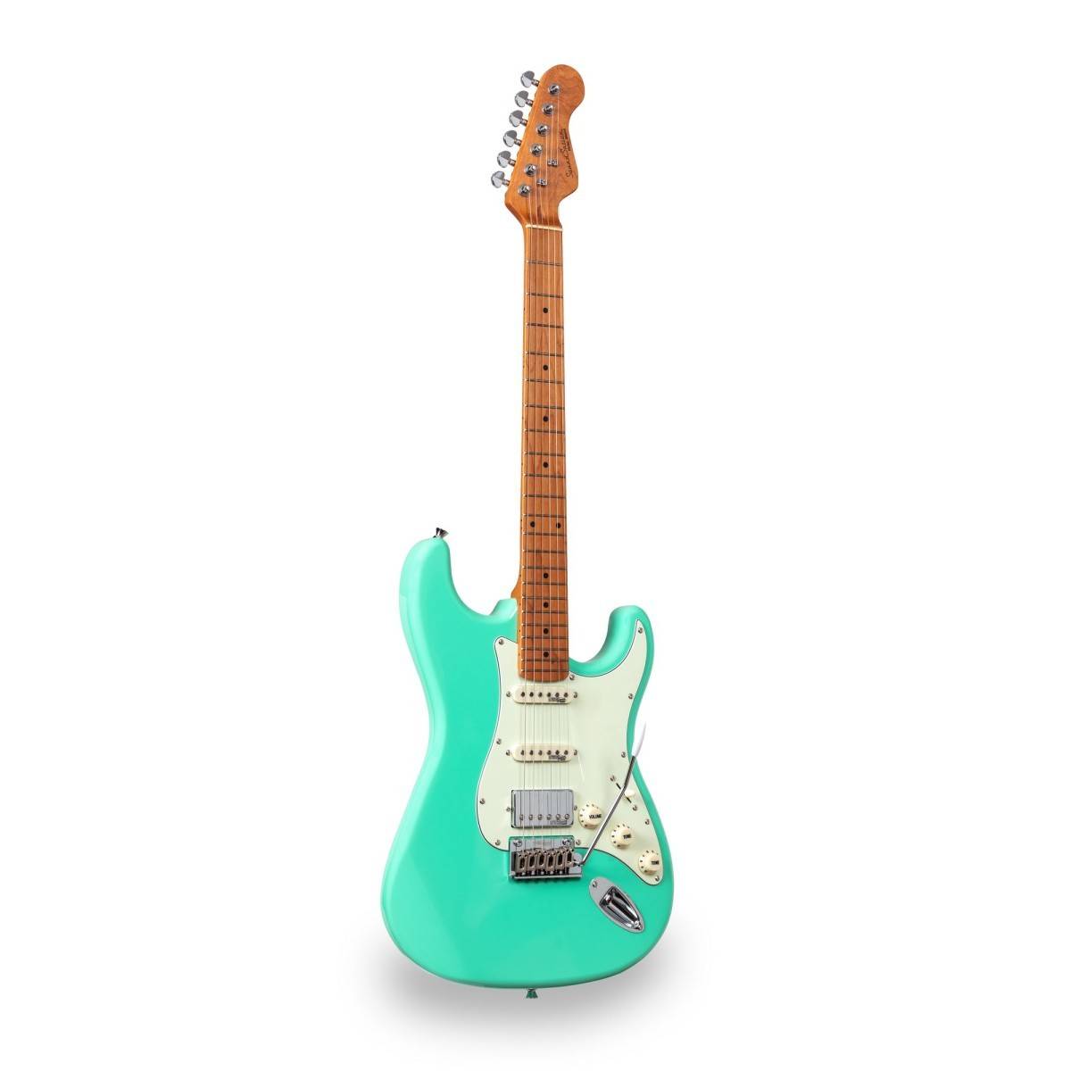 Corpo: ontano Manico e Tastiera: acero roasted satinato Tasti: 22 Meccaniche: cromate autobloccanti Ponte: Wilkinson tremolo a 2 viti Pick up: 2 single coil Wilkinson + 1 humbucker splittabile Wilkinson coperto con sistema push/pull Switch: 5 vie Potenziometri: volume/tono/tono + push/pull Mascherina: mint green Colore: sea foam green Equipaggiate con D'Addario XL