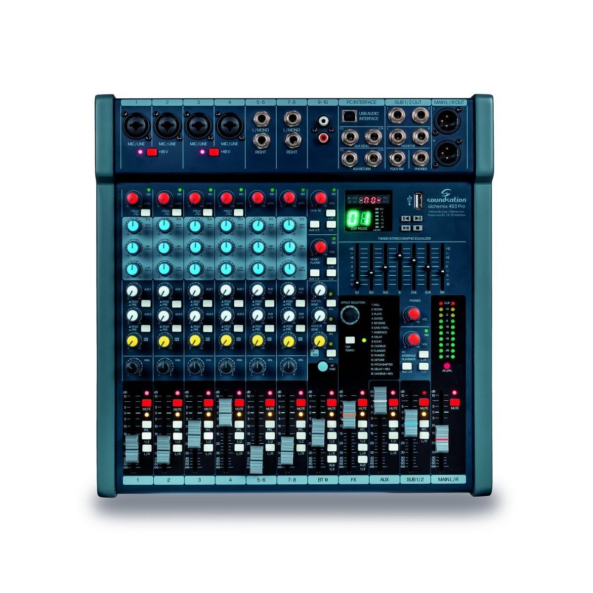 10 canali (4 ingressi microfonici + 3 ingressi di linea stereo) Low-cut a 75Hz e Phantom 48 V su tutti gli ingressi microfonici Equalizzatore a 3 bande, 2 mandate Aux con selezione Pre/Post 1 bus effetti, Mute, PFL-AFL, Sub e assegnazione L-R Lettore Bluetooth e USB con volume e assegnazioni separati Scheda audio con ingresso/uscita USB (48 kHz †24 bit) Effetti digitali di alta qualità a 24 bit con 16 preset regolabili e pulsante Tap Tempo Equalizzatore grafico a 7 bande, ritorno AUX a 2 canali, sottogruppo a 2 canali, controllo di riproduzione della scheda audio