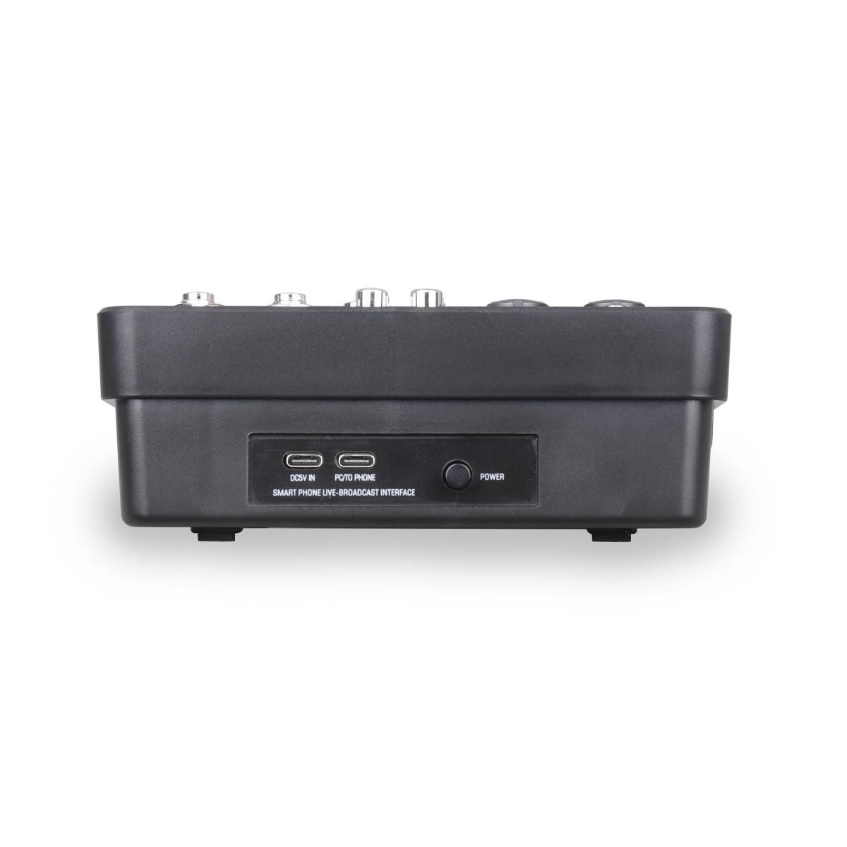 2 ingressi microfonici con combo XLR 2 ingressi di linea con jack da ¼" e RCA OTG con USB Type-C e mini-jack TRRS Scheda audio con porta host PC/telefono Type-C Bluetooth Ingresso microfono 5V Effetto digitale con 4 preset regolabili (Hall, Plate, Room, Echo)