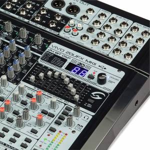 VIVO 20 MKII è un mixer professionale studiato sia per applicazioni Live che in studio. La nuova versione MKII è equipaggiata con il multieffetto Ambient Pro® con 99 effetti di alta qualità. I 20 ingressi coprono una vasta gamma di possibilità di utilizzo e i pre-amp noise-less assicurano un rapporto segnale rumore eccellente così come i fader 80 mm di qualità superiore impediscono la riproduzione dei consueti fruscii durante la regolazione del volume. Essendo una workstation professionale il VIVO è dotato di 4 mandate AUX regolabili con i relativi ritorni nonchè di 4 sottogruppi dedicati al routing di più canali verso l'esterno o verso il MAIN. La sezione Master presenta un VU Meter a 12 segmenti con indicazione del Clip e la regolazione indipendente dell'uscita cuffie e dell'uscita control room, utile all'ascolto in regia in contesto di Studio. La sua struttura in metallo ultra-resistente permette l'utilizzo di questo mixer all'aperto in qualsiasi condizione meteo. L'uscita USB 2.0 consente la registrazione in tempo reale su qualsiasi DAW rendendolo di fatto una potente risorsa di registrazione.