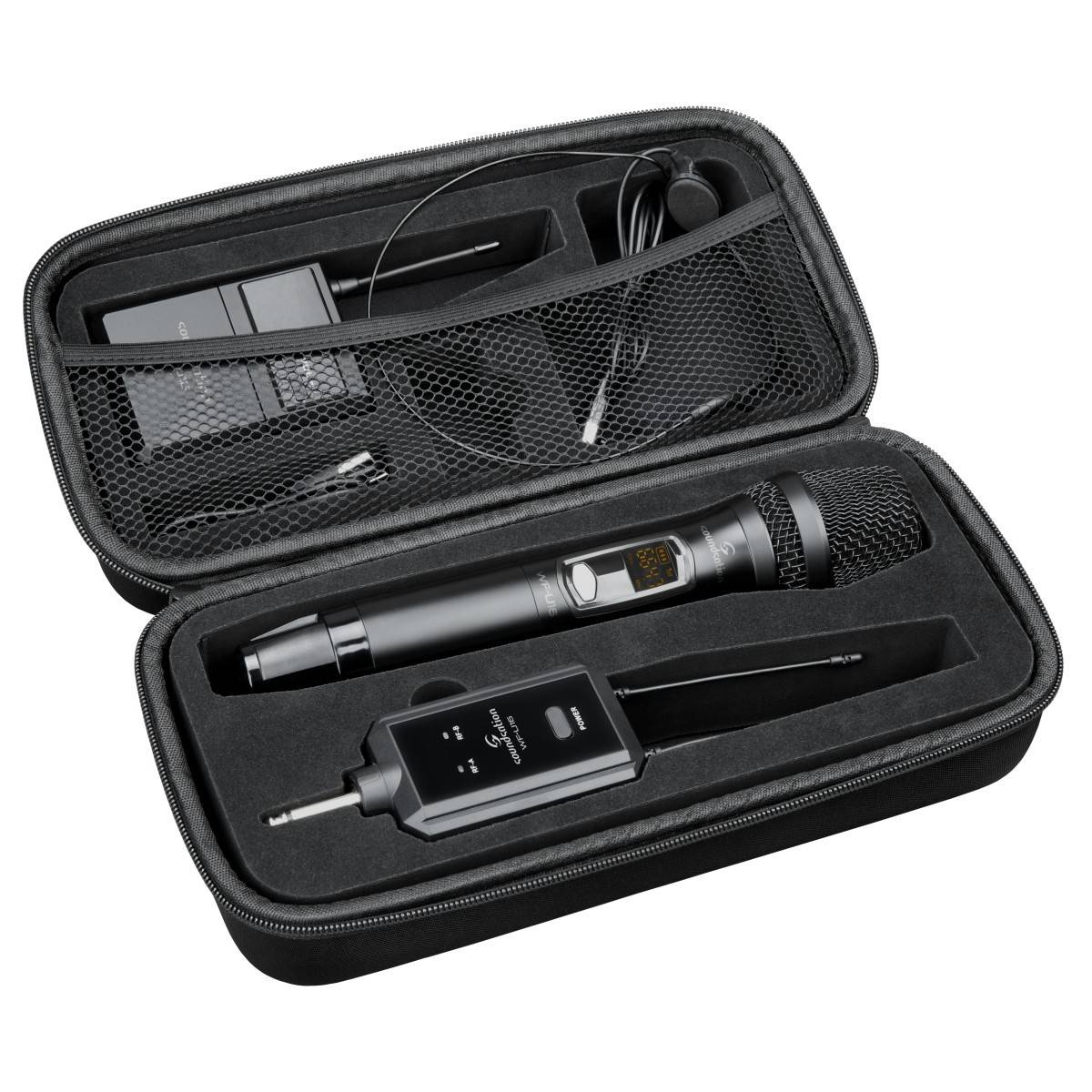 Sistema UHF compatto ma professionale Installazione e uso semplicissimi 2x16 canali selezionati automaticamente al momento dellccensione Ricevitore con batteria al Litio ricaricabile Microfono Gelato con display e capsula cardioide professionale Trasmettitore Tascabile con connettore mini-XLR a 3-pin Microfono ad Archetto con Capsula a Condensatore Cardioide Professionale Visualizzazione del livello di carica delle batterie Custodia imbottita inclusa