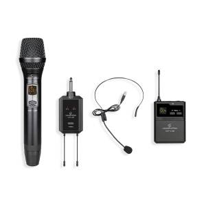 Banda UHF da 606-613.5 MHz 16 canali per ciascun microfono (32 canali in totale) Interfaccia utente semplice e chiara con display su trasmettitori e ricevitore Design a chip singolo con preamplificatore di alta qualità, elaborazione audio DSP e sintesi PLL Sistema di accoppiamento IR per una rapida configurazione Circuiti a basso consumo delle batterie 50m Distanza ideale (senza ostacoli) Microfono portatile professionale con capsula cardioide dinamica Body-pack con connettore Mini-XLR a 3 pin e display LCD Microfono ad archetto professionale e leggero con capsula cardioide a condensatore ad alta sensibilità