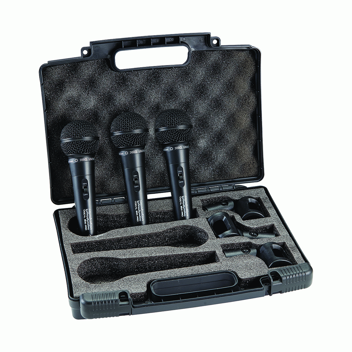 La serie VOCAL di microfoni SOUNDSATION rappresenta la risposta ideale a tutti quegli utenti che necessitano di strumenti di lavoro robusti, affidabili, in grado di valorizzare al meglio la gamma di frequenze tipica delle estensioni vocali maschili e femminili, e di strizzare lcchiolino a proprio portafoglio. Il VOCAL 300 PRO 3P è un set composto da 3 microfoni dinamici professionali VOCAL 300 PRO con relativi supporti per asta microfonica, il tutto racchiuso in una praticissima valigetta imbottita. Rappresenta un ottimo strumento di lavoro per chi deve microfonare numerose voci o strumenti e vuole un trasduttore dinamico professionale con diagramma polare cardioide ad elevata sensibilità, ampia risposta in frequenza e capacità di utilizzo con pressioni sonore elevate.