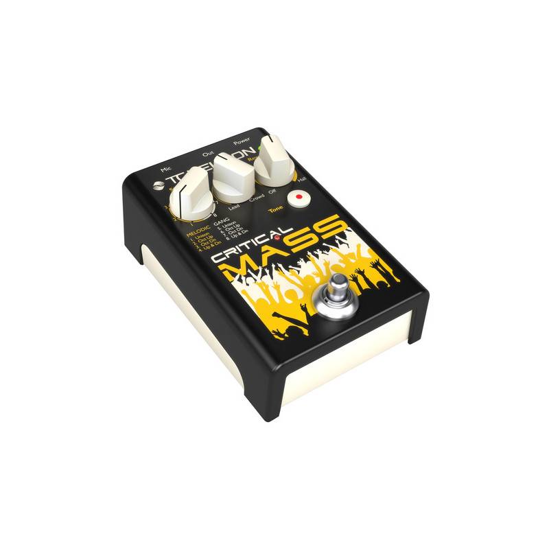 EFFETTO SONORO VOCALE DI GRANDI GRUPPI Il pedale TC-Helicon Critical Mass aggiunge il suono e la sensazione delle voci di gruppo alle tue performance, pulendo dinamicamente nello stesso tempo il suono della voce per uno splendore da studio. Con un tocco degli intuitivi controlli Style e Mix, è possibile ottenere tutto, dall'ottava su all'accompagnamento vocale all'unisono negli stili Melodic e Gang. Sono disponibili tre tipi di riverbero TC Electronic con un controllo mix indipendente. E l'elaborazione adattativa del suono aggiunge automaticamente EQ, compressione, de-essing ed altro ancora. Se hai bisogno del suono massiccio di un gruppo di vocalist per il tuo spettacolo solista, prova il TC-Helicon Critical Mass.4 Stili di coro melodico 4 Stili Vocal Gang 3 Stili di riverbero (Room Club Hall) Tono adattivo Alimentazione a batteria AA opzionale Facile collegamento tra microfono e mixer Alimentazione Phantom sempre disponibile Preamplificatore microfonico a basso rumore Guadagno d'ingresso automatico Costruzione robusta interamente in metallo Mic Control per lo switch On/Off remoto con i microfoni opzionali TC-Helicon MP-75 MP-76 (solo pulsante principale) e Sennheiser e835 FX Controlli indipendenti di stile e mix per le voci di gruppo Connessione USB all'applicazione VoiceSupport che offre aggiornamenti notizie specifiche sul prodotto e altro ancora Funzionamento a 9V (invece di 12V) per usare i comuni alimentatori delle pedaliere