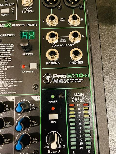 Filtro low-cut 100Hz e alimentazione phantom 48V su tutti i canali microfonici